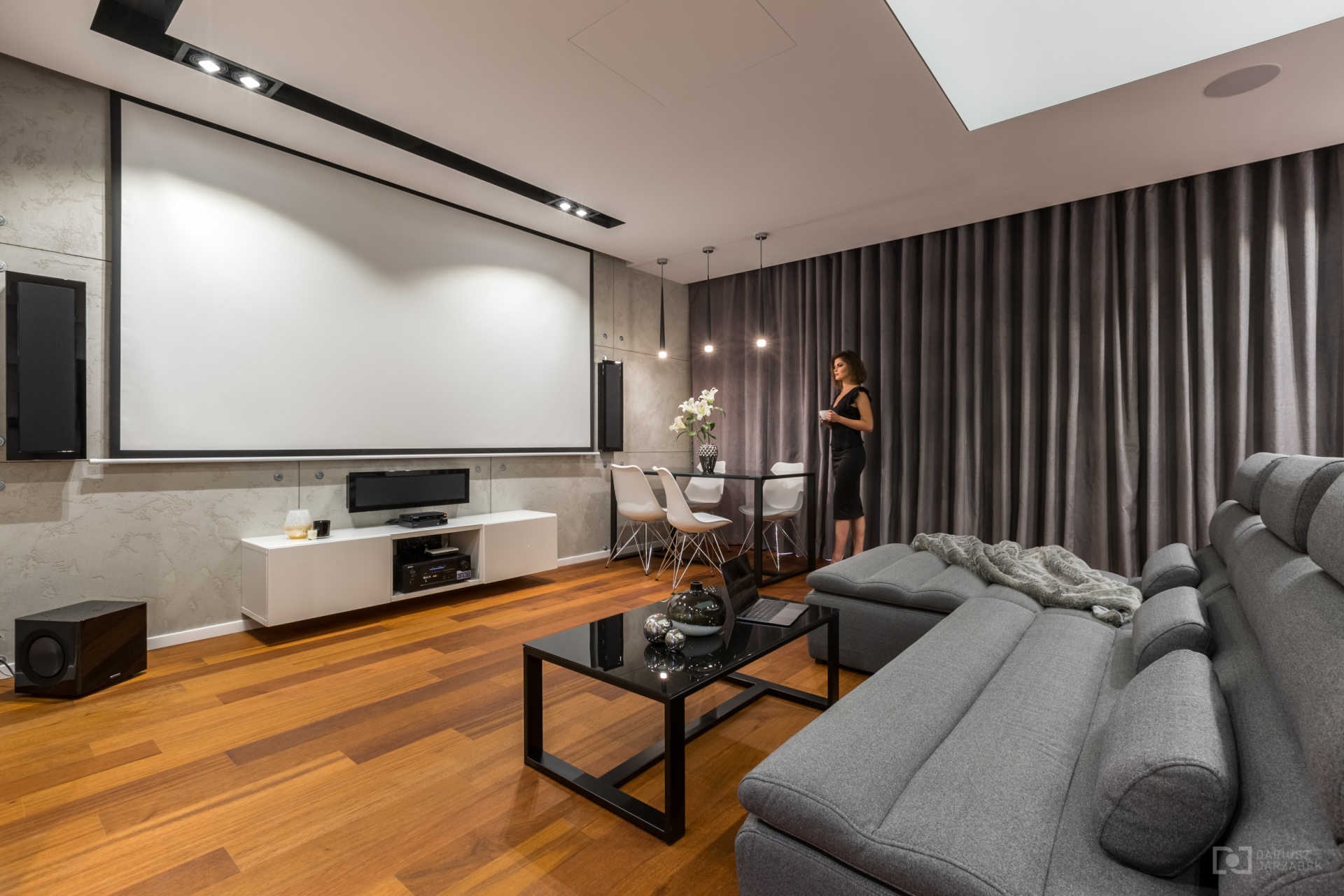 screen with projector, Denon home theater and nice light architecture, creating a sensual mood.