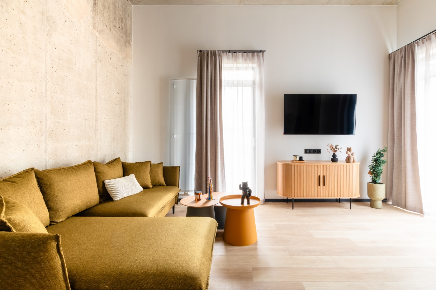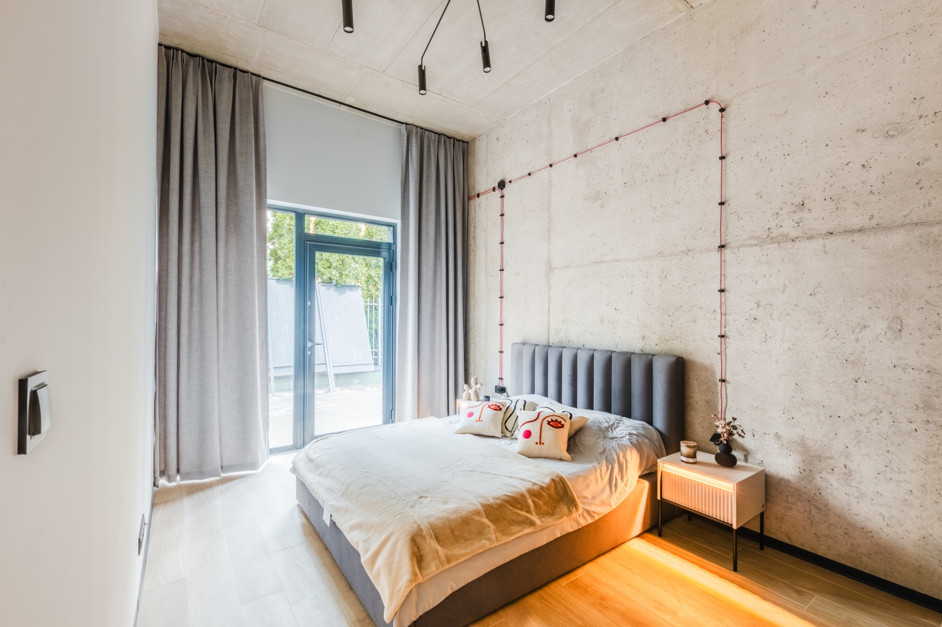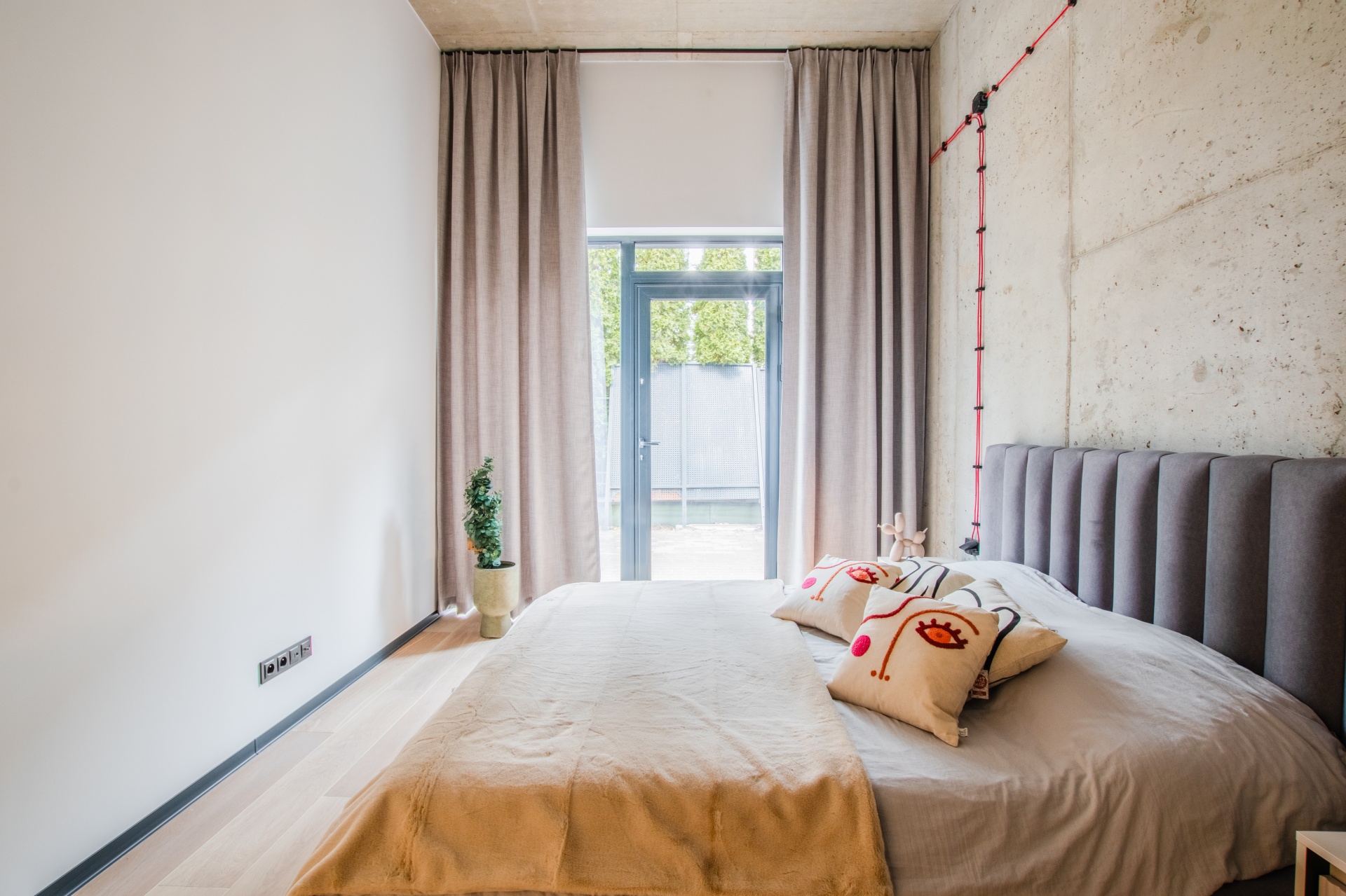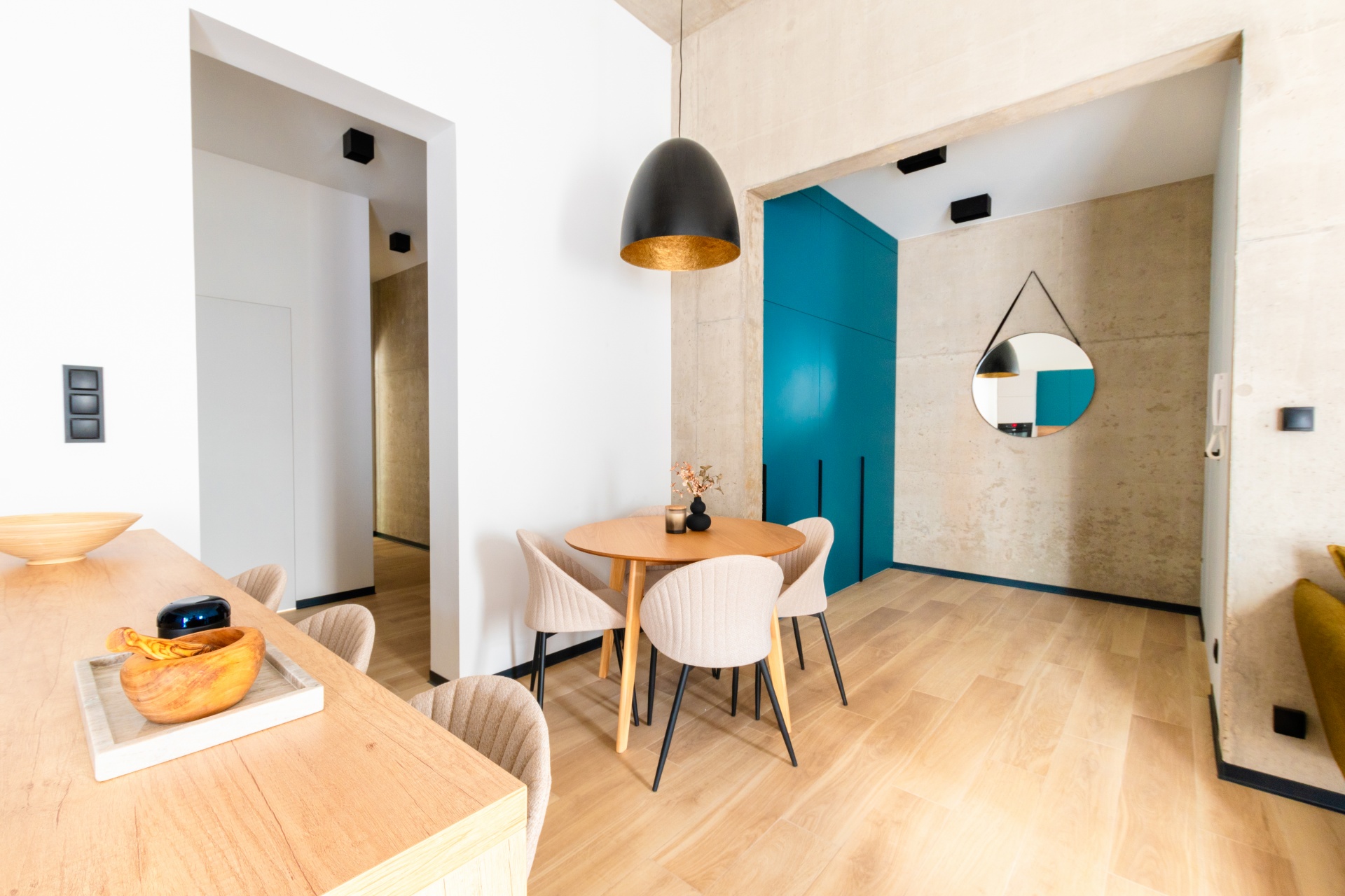 Nieruchomość składa się z salonu z otwartą kuchnią oraz jadalnią, przedsionku, dużej sypialni , przestronnego hallu, łazienki oraz drugiego pokoju z możliwością do dowolnej adaptacji np. home office lub druga sypialnia. Całość utrzymana w stylistyce łączącej modernistyczną surowość z domową atmosferą. Niewątpliwym atutem mieszkania jest prywatna przestrzeń zewnętrzna, swoista fuzja ogródka z tarasem na który prowadzą wyjścia po całej długości apartamentu. Do mieszkania przynależy miejsce parkingowe, znajdujące się w garażu.